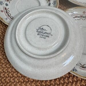 Set of four vintage saucers, perfect for adding a touch of rustic charm to your table setting. 6" across. Great condition. International Stoneware Japan.