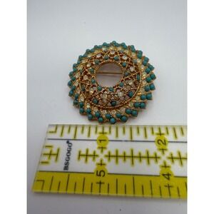 Adorn yourself with this dazzling Sarah Cov Aquarius sunburst brooch, a radiant statement piece that captures the light and attention of any room. Intricate gold-tone filigree forms a mesmerizing circular pattern, lovingly embellished with a vibrant halo of turquoise beads and sparkling clear crystals. Each tiny gem reflects light, creating a captivating shimmer that adds a touch of glamour to any outfit. This exquisite accessory is perfect for elevating your everyday look or adding a final, unforgettable flourish to your evening attire. Imagine this stunning brooch gracing your lapel at a garden party, a special anniversary dinner, or a sophisticated cocktail reception.
