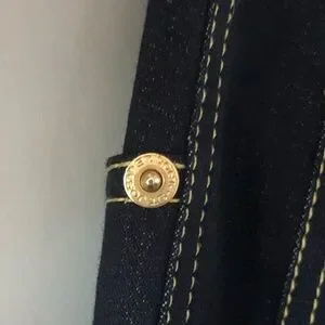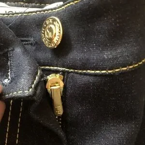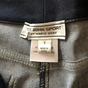 Stylish dark stretch jeans from St. John Sport by Marie Gray, women's size 0, in excellent pre-owned condition, no flaws. Features gold stitching, button, rivets, and logo detail. Perfect for casual wear or elevated with a silk blouse and heels or dressy flats. Slight bootcut shape. Zip fly and button closure. No belt loops. Casual chic.