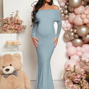Baby Blue Elegant Women's Maternity Foldover Off Shoulder Mermaid Hem Dress