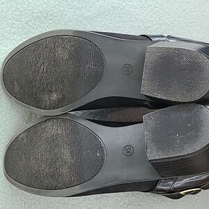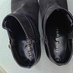 These pre-owned Karen Scott Black Strap Detail Ankle Boots in size 9.5M are stylish and versatile for various occasions such as casual, formal, or business. With an almond toe shape and block heel, these boots feature zip closure and strap details for added flair. Made of faux suede, these boots are designed for regular calf width and a comfortable low heel height. Perfect for the modern woman looking for both fashion and practicality in her footwear.