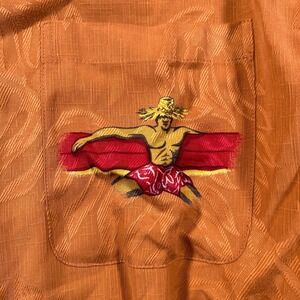 The Reyn Spooner M.Field Shirt is a vibrant orange silk button-up shirt with a Hawaiian surfer print, perfect for casual occasions, travel, or parties. This short-sleeve shirt features a collared neckline and a woven fabric type, making it stylish and comfortable to wear. With a regular fit and size large, this shirt is a unique addition to any man's wardrobe, showcasing the brand's quality and attention to detail. Ideal for the summer, fall, and spring seasons, this shirt also includes accents like buttons and pockets for added convenience.