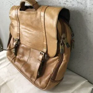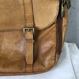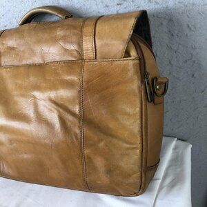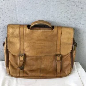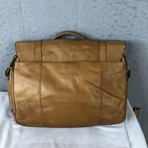 Style: Brown leather laptop bag and briefcase with flap-over top and soft, lightly structured body.