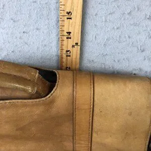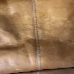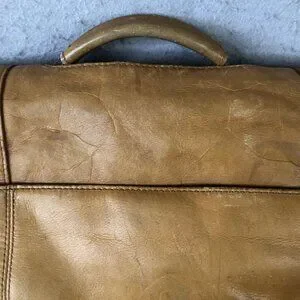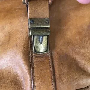 Nice Distressing..Leather shows heavy wear with scuffs, scratches, creasing and darkened spots, especially on corners, edges and back. Hardware is tarnished and the handle and flap are visibly worn. Interior lining shows light wear with a few small marks; zippers and clasps operate properly, and the shoulder strap is missing. Missing over shoulder strap