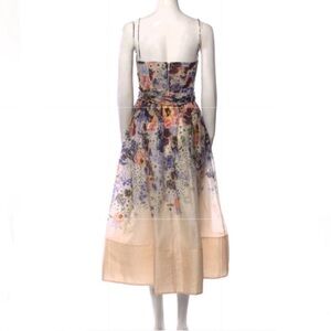 Elegant Zimmermann midi dress with floral print. Features a fitted bodice and flared skirt. Delicate straps and waist tie accentuate the silhouette.