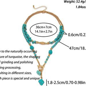 Features: This layered turquoise pendant necklace has a fun, wild vibe with irregularly shaped, raw stone beads and a bold gold chain. Perfect for adding a pop of color and texture to any outfit, from casual T-shirts to dressier looks.