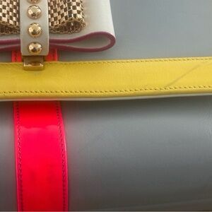 Preloved Authentic gorgeous in good shape and condition with minor signs of use. Beautiful tricolor, interior clean, exterior has pen mark on front yellow leather and rubbing on front bottom coral color in pic, hardware are in excellent condition, this bag is convertible as shoulder bag and crossbody bag