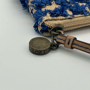 Stylish clutch wristlet featuring a blue and tan design. Perfect for any occasion.