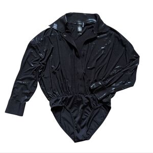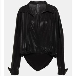 Norma Kamali Black Super Oversized NK Boyfriend Plunge Bodysuit Shirt S Lamé