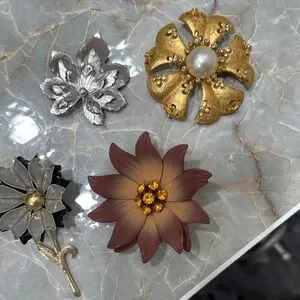 Add a touch of sophistication to your ensemble with this stunning floral brooch set. Featuring elegant gold and silver tones, these brooches are perfect for any occasion. Great addition to your vintage costume jewelry collection!