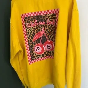 Bright yellow sweatshirt featuring a cherry design on the chest. Perfect for casual wear. Small stain on front.