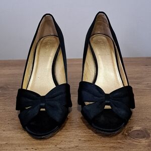 J. Crew Black Heels Women's Size 8 Fabric Upper Bow Open Toe Gold Made in Italy