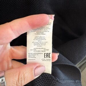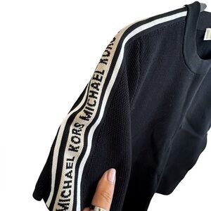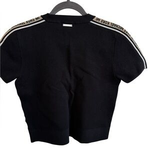 Michael Kors Logo Tape Textured Knit Short-Sleeve Sweater. Size: L,(true to size but has some stretch to it) Color: Black. Good condition this fabric picks up all lint and fuzz. Photos will reflect this.