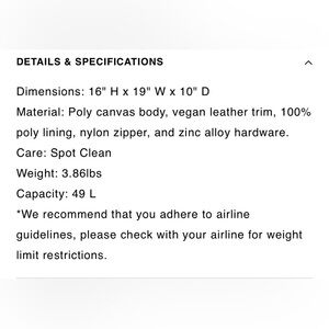Material: Poly canvas body, vegan leather trim, 100% poly lining, nylon zipper, and zinc alloy hardware.