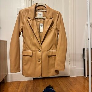 Chic tan blazer with a modern fit. Features notched lapels and button closure. Perfect for a sophisticated look.