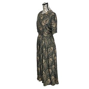 Vintage 1980s paisley midi dress in size 7/8 (Small). Modest, boho, cottagecore, and peasant-inspired silhouette with elbow sleeves and a flowing skirt. Perfect retro fall dress.