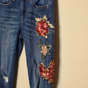 Beautiful pre-owned condition Women's Embroidered and Sequenced Mid-Rise Stretch Denim Leggings from Express in size OR. Gorgeous floral embroidery with sequenced accents. Button closure with zipper fly and skinny leg. Made of 75% cotton, 24% polyester and 1% spandex. Please see pictures for measurements and condition.