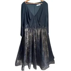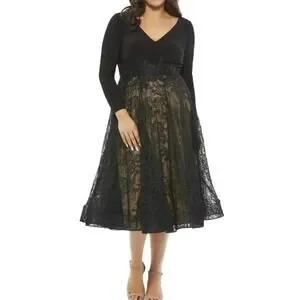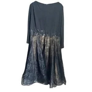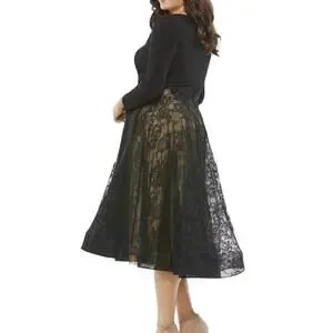 Designed for a two-in-one look, this jersey and lace dress does the difficult styling work for you. The sleek bodice is fashioned with a V-neckline, princess seams, and fitted long sleeves. Embellished embroidery flowers highlight the waist and connect the top with the fully-lined lace skirt banded for a swishy A-line shape.