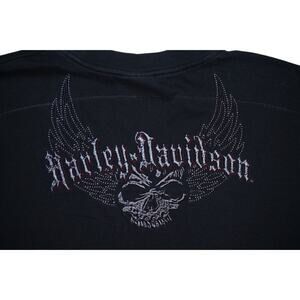 Ride in bold style with this Harley-Davidson short sleeve tee, featuring heavy embroidered skull and wing graphics on both the front and back. The gothic-style Harley-Davidson text adds a tough edge, while the thick 100% cotton fabric delivers a premium, broken-in feel. A true collector-style piece for fans of biker and streetwear fashion.