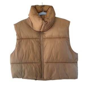 Keywords: Amazon vest, women's puffer vest, beige vest, winter vest, casual wear, sleeveless jacket, high neck collar, adjustable hem, lightweight outerwear, pre-owned vest.