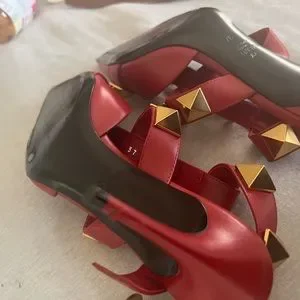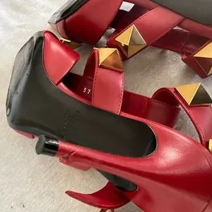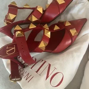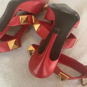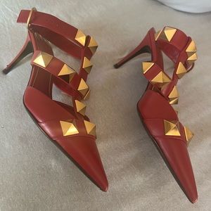 Step out in style with these stunning red studded heels from Valentino. Perfect for adding a bold touch to any outfit.