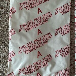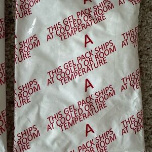 Set of three gel ice packs. Red text on white background. Ideal for keeping items cool.