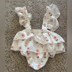 Delightful floral bodysuit with ruffle details, featuring a lovely pink and white design. Ideal for fun-filled days.