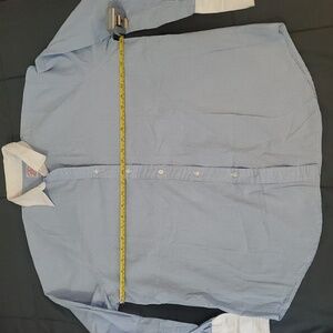 Elegant button-down shirt with blue body and white collar. Ideal for formal and casual wear.