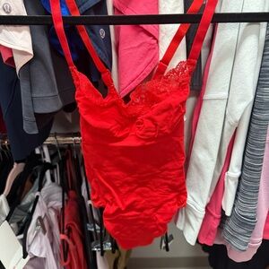 Elegant scarlet bodysuit with delicate lace detail. Flattering fit and versatile style.