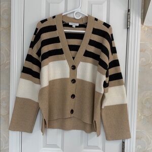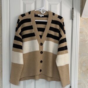 Ann Taylor Weekend Trendy Striped Beige and Charcoal Cardigan Sweater