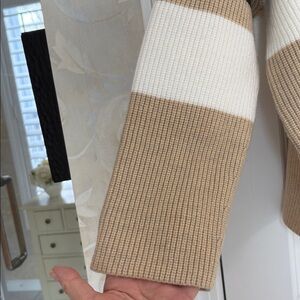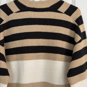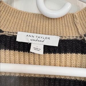 Stay cozy and stylish with this Ann Taylor striped beige and charcoal sweater. Perfect for any casual outing. Part of the popular Ann Taylor Weekend Collection. Ribbed knit. Acrylic, nylon and polyester. Rich tones. Fun and functional. Measures 24” across chest and 23” and 26” long (high/ low hem). Bold tortoise buttons. Washable and in Excellent Condition.
