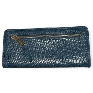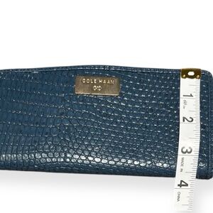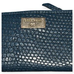 Elegant blue Cole Haan wallet with crocodile texture. Features metallic logo accent. Very spacious and has many pockets as pictured. Measurements included in photos.