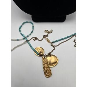 Beautiful signed Chan Luu long layering necklace featuring smooth turquoise and white quartz beads accented with hammered gold-tone coin charms. Measures approximately 38 inches in total length with a secure lobster clasp closure. The natural variations in the beads and the artisan-style charms give this piece its distinctive bohemian character.