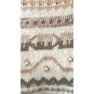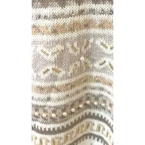Keywords: Jacque KoKo sweater, striped sweater, beaded embellishment, pearl detail, boho chic, vintage knitwear, neutral tones, fashion sweater, casual wear, evening layering, unique design, textured knit