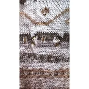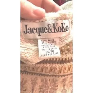 Jacque & KoKo women's sweater in a size 14/16, featuring a stylish beige and brown striped pattern. This piece is beautifully embellished with delicate beads and pearls, adding a touch of unique detail. A perfect addition for a casual outing or a chic layering piece for cooler evenings.