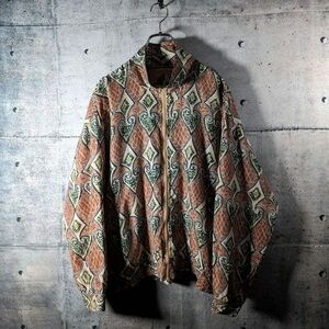 Statement vintage jacket with an eye-catching geometric + paisley-inspired print in earthy browns, greens, and cream. Lightly quilted with a soft blush satin lining, zip-front closure, and relaxed bomber-style fit. Perfect layered over a slip dress or styled casually with denim.