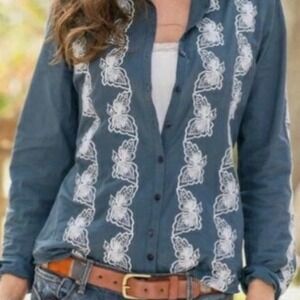Beautiful Sundance blouse in a blue with striking white butterfly embroidery throughout the front, back, and sleeves. Made from lightweight 100% cotton with a classic button-front, pointed collar, and long sleeves with button cuffs.