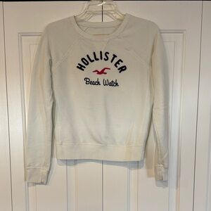 Cream sweatshirt with Hollister Beach Watch logo. Casual and cozy.