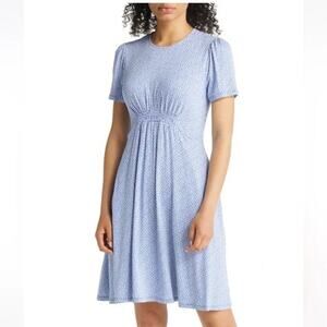 This dress by Boden is brand new without tags! It is a pull on style with smocked elastic detail at the front of waist to create a flattering shape and has side pockets. Fabric is a viscose blend in the color bluebell and has a geometric/tile like print (see close up). No piling/wear, dress is brand new!