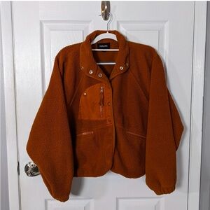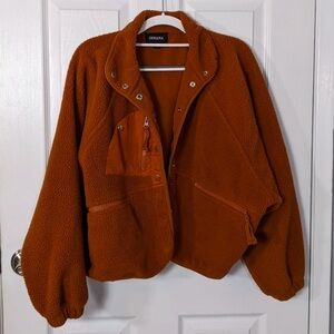 Jacket, Coat, Teddy, Teddy Jacket, Comfy, Polyester, 100% Polyester, Snap Closure, Snap Up, Button Up, Button Down, High Neck, Mock Neck, Fall, Crop, Cropped, Long Sleeve, Zenana, Women, Woman, Women's, Cozy, Warm, Casual, Everyday, Trendy, Winter, Layers, Layering Piece, Orange, Burnt Orange, Autumn, Autumnal, Size Medium, Size M, Pockets, Collar, Collared, Balloon Sleeves, Raglan Sleeves, Zipper Pockets, Sherpa, Fleece, Cropped Jacket, Natural Waist, Oversized, Loungewear, Athleisure