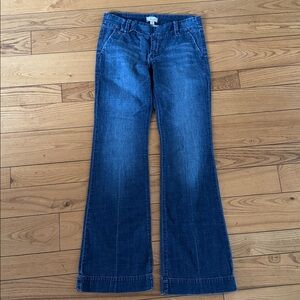 These medium to dark wash lightweight trouser jeans have a wide bottom hand and trouser like details. Extended belt like waist, slash pockets and trouser back pockets. Waist measures approximately 16 inches with a low rise coming in at approximately 7 1/2 and an inseam of approximately 32 inches. Factory fading on the front and factory look creasing. They taper at the knee and then widen for a very flattering fit. no callouts other than some minor wear on the bottom of the cuff as shown. No material tag, but has slight two way stretch.