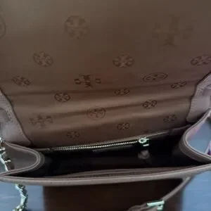 Tan Tory Burch crossbody bag with gold accents.