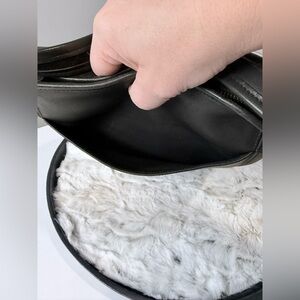 • Pre-owned with minor wear: some corner rubbing and three small blemishes on exterior (can be minimized with leather conditioning).