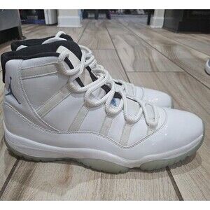 The Nike AIR JORDAN 11 RETRO LEGEND BLUE 2014 model 378037 117 in size 13 is a stylish and comfortable sneaker perfect for activewear. Featuring a lace-up closure, rubber outsole, and patent leather upper, this athletic shoe is designed for basketball performance. With a solid blue color and retro theme, this Air Jordan 11 model is a must-have for any sneaker collection. The foam insole provides added comfort, making it a great choice for spring seasons.