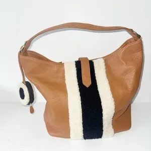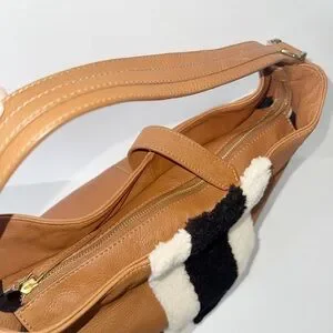This is an Hobo Bag from Clever Carriage Company in Tan Leather with Shearling work on one side: two Light strips & a Black strip.