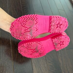 Stylish transparent boots with vibrant pink soles. Features iconic American Girl branding.