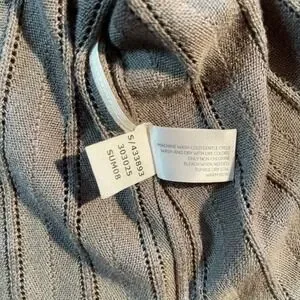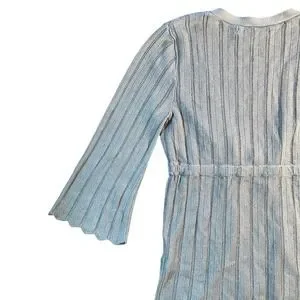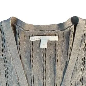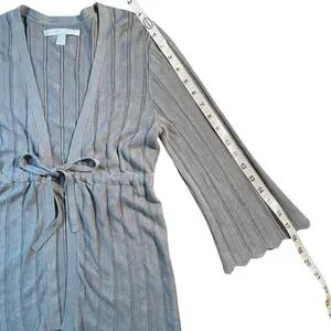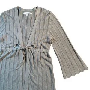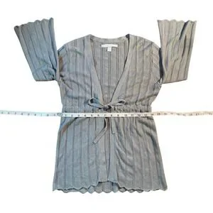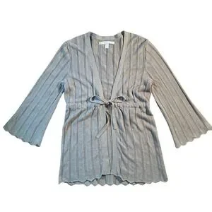 Wrap yourself in effortless charm with this Vintage OLD NAVY knit cardigan. The delicate vertical ribbing creates a flattering silhouette, while the adjustable tie waist cinches beautifully to accentuate your figure. Bell sleeves with a charming scalloped hem add a touch of whimsical flair, making this a perfect layering piece for a breezy spring day or a cozy evening out.