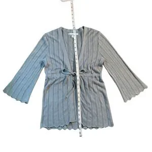 Vintage Gray Ribbed Knit Tie Waist Scalloped Hem Cardigan Sweater Small Y2K 90s