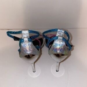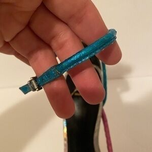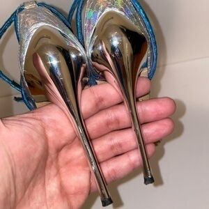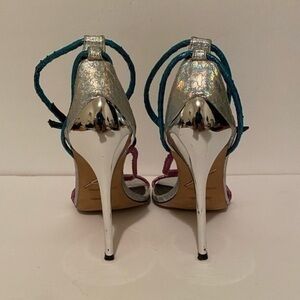 Gorgeous heels with an iridescent silver with pinkish purple and blue straps. Some signs of wear throughout but no eyesores. Please see photos.