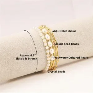14K Gold Plated Bracelet Set: A simple and exquisite bracelets set. Contains: 1 pcs gold plated seed beaded bracelet, 1 pcs crystal beads bracelet, 1 pcs paperclip link chain bracelet and 1 pcs gold plated bead with pearl beads bracelets designs
